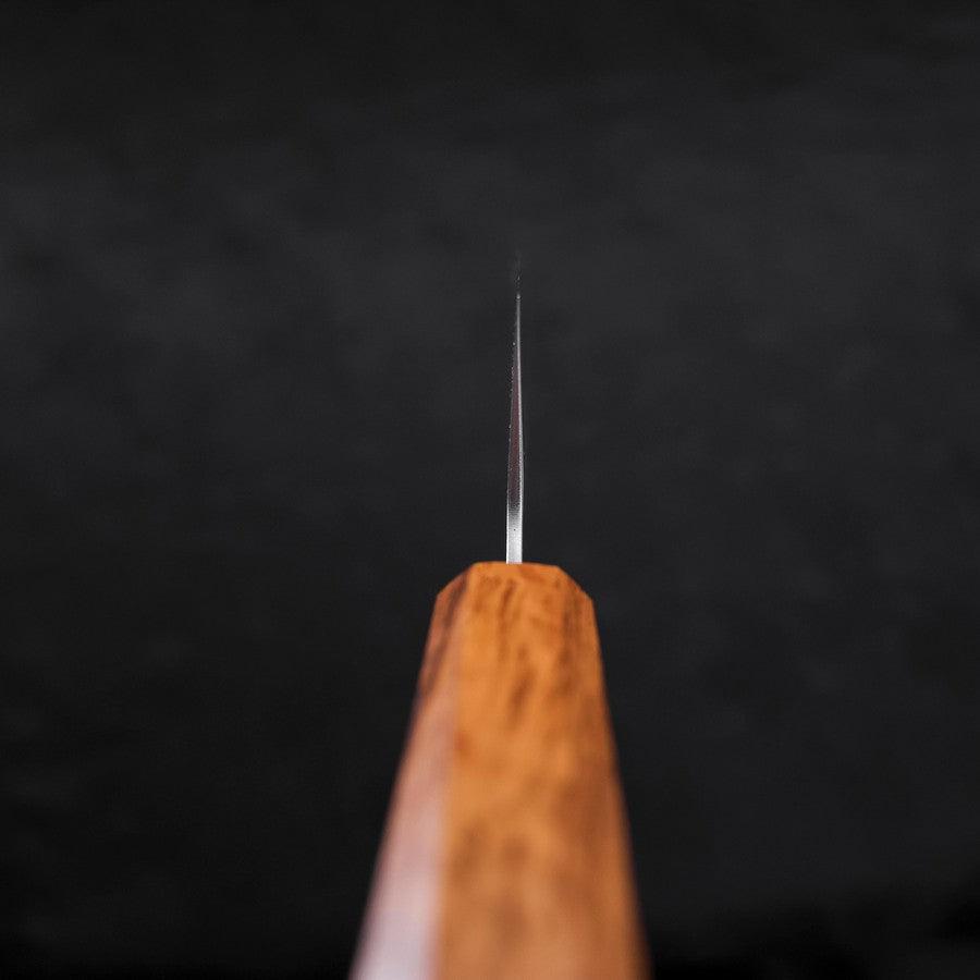 “Kiritsuke” knifes are an all-purpose knife featured a diagonally cut-off tip. Kiritsuke knives are one of the few multipurpose traditional Japanese blades, and can be used as a slicer or a vegetable knife. These sword shaped knives feature a straighter and wider edge than a yanagi for vegetables, and a longer blade than an usuba for slicing fish with ease. The user needs more skill with traditional Japanese knives in order to utilize this unique kiritsuke style design properly. Traditionally, these knives are used only by the chefs as a symbol of status.