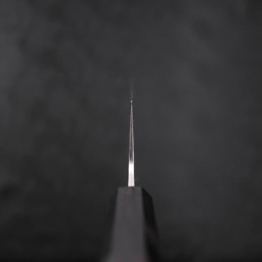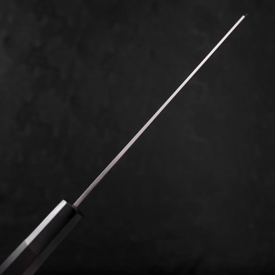 “Kiritsuke” knifes are an all-purpose knife featured a diagonally cut-off tip. Kiritsuke knives are one of the few multipurpose traditional Japanese blades, and can be used as a slicer or a vegetable knife. These sword shaped knives feature a straighter and wider edge than a yanagi for vegetables, and a longer blade than an usuba for slicing fish with ease. The user needs more skill with traditional Japanese knives in order to utilize this unique kiritsuke style design properly. Traditionally, these knives are used only by the chefs as a symbol of status.