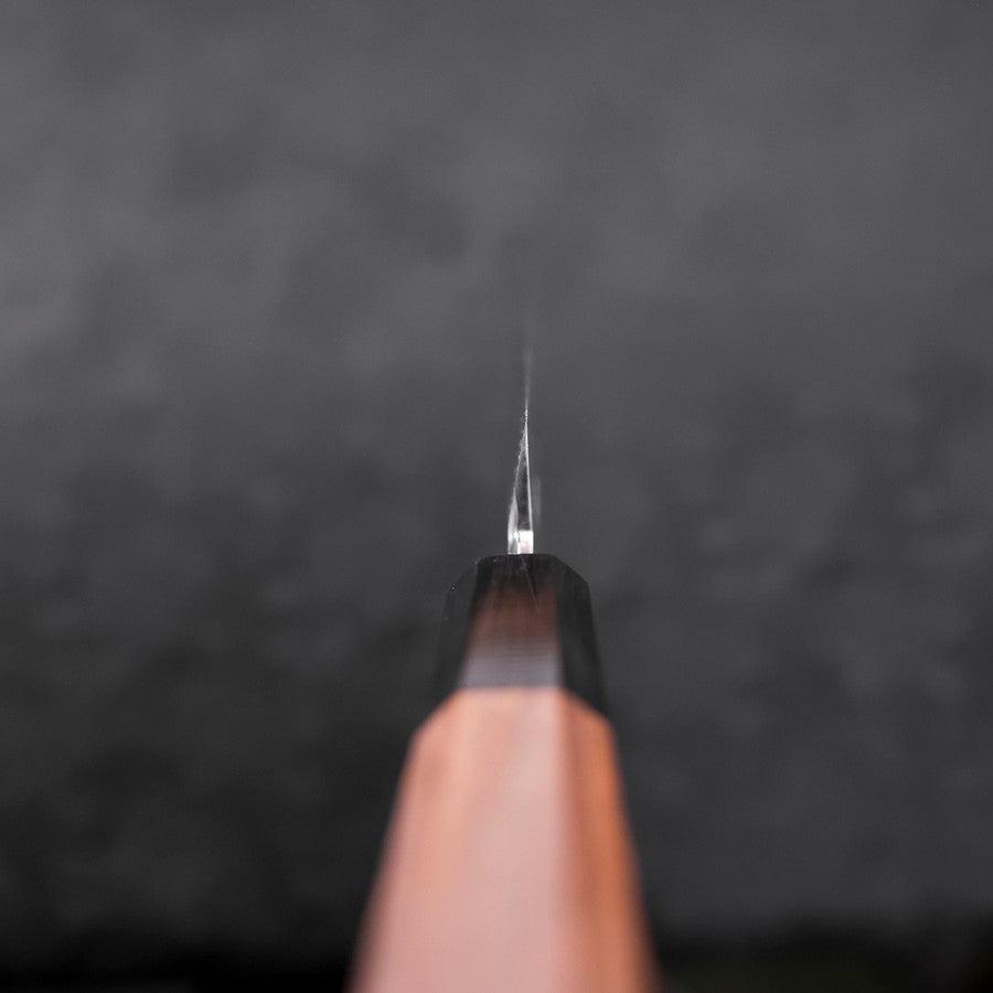 The Yanagi is a long slicing knife that was designed to slice thin slices of fish for sushi and sashimi. The beauty of its elegant thin blade is its ability to slice through an ingredient in long uninterrupted strokes, preserving its integrity and freshness. The Yanagi Kiritsuke is slightly heavier with a blade that is wider and a spine that is thicker. The sword tip helps balance the weight of the knife and is recommended for chefs who are interested in a Yanagi but have a smaller working space. Even the simplest of tasks are elevated with a handcrafted knife that is as beautiful as it is functional.