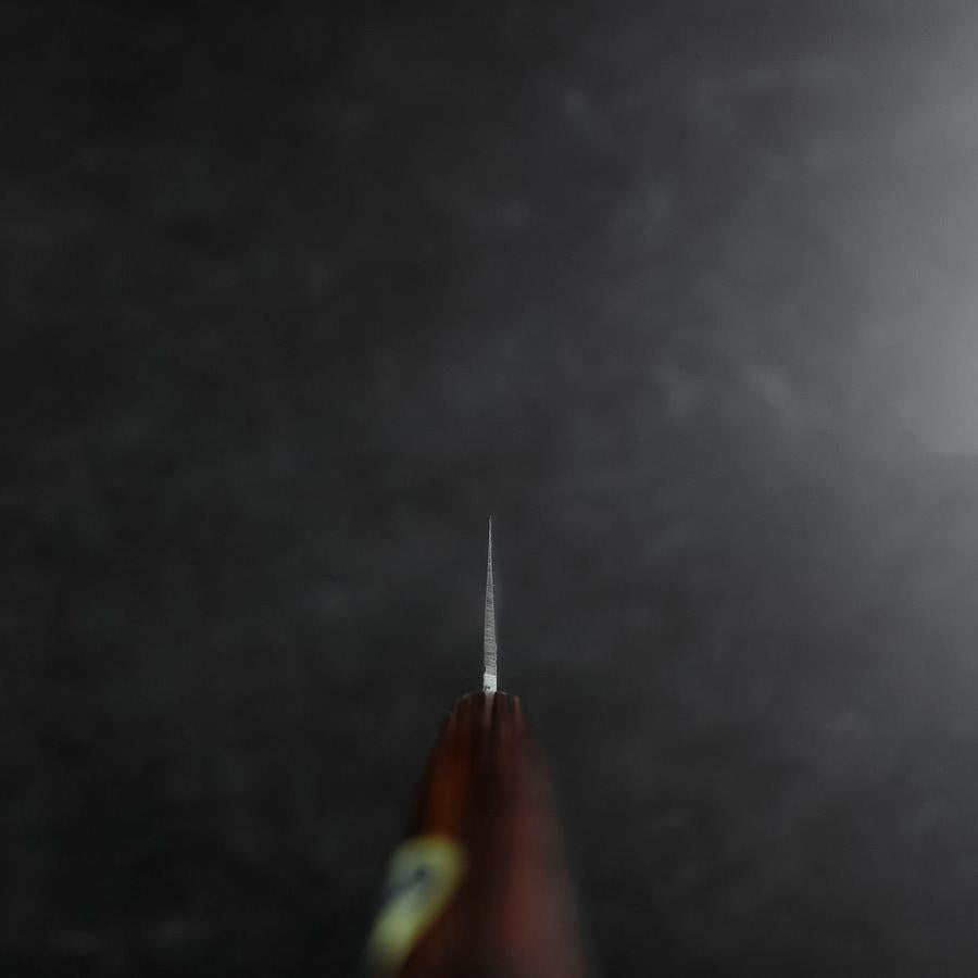 The Gyuto is an all-purpose knife with a pointed tip and a slender blade. The pointed tip enables an easy targeted cut and helps slice meat and fish. It used to be a knife for professional chefs but nowadays is also used by households. Its curved blade helps you apply force to cut food without effort.