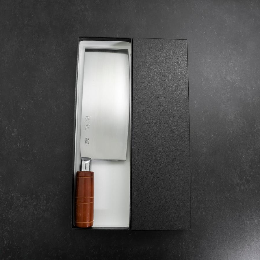 Chinese Cleavers are generally available in blade lengths between 180 and 220 mm, with a typical blade height of around 100mm. Their weight varies from a relatively light 300g up to a massive 900g! Their large, heavy blades are suitable for breaking down chickens, mincing meat and vegetables, and even scraping ingredients.