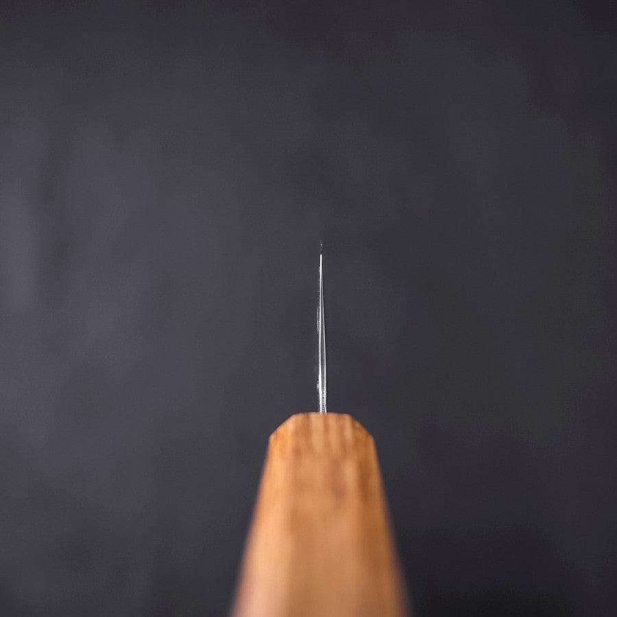 The Gyuto is an all-purpose knife with a pointed tip and a slender blade. The pointed tip enables an easy targeted cut and helps slice meat and fish. It used to be a knife for professional chefs but nowadays is also used by households. Its curved blade helps you apply force to cut food without effort.
