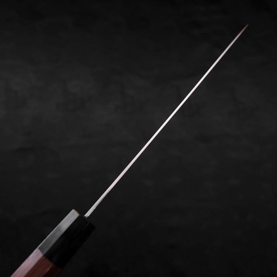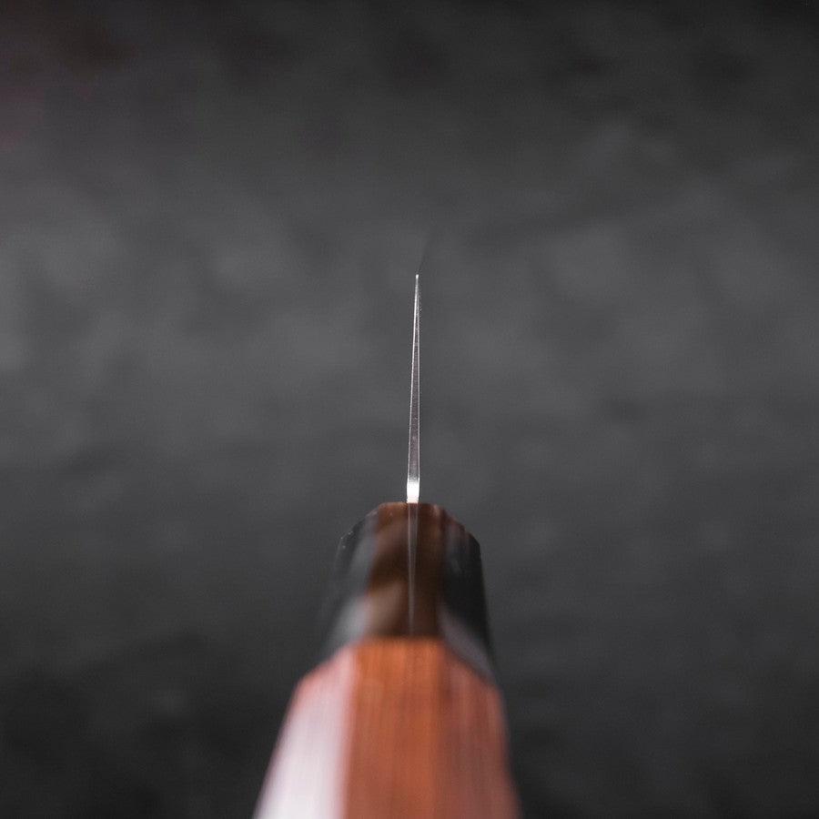 The Gyuto is an all-purpose knife with a pointed tip and a slender blade. The pointed tip enables an easy targeted cut and helps slice meat and fish. It used to be a knife for professional chefs but nowadays is also used by households. Its curved blade helps you apply force to cut food without effort.
