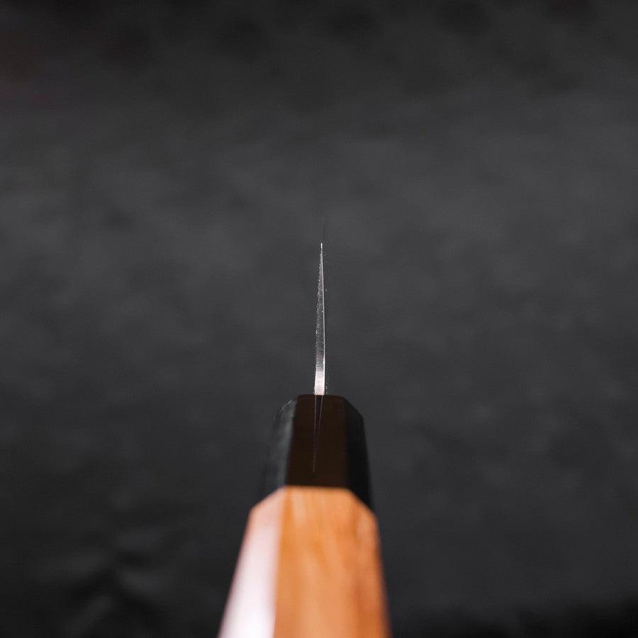 The Gyuto is an all-purpose knife with a pointed tip and a slender blade. The pointed tip enables an easy targeted cut and helps slice meat and fish. It used to be a knife for professional chefs but nowadays is also used by households. Its curved blade helps you apply force to cut food without effort.