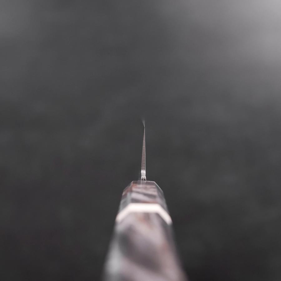 The Gyuto is an all-purpose knife with a pointed tip and a slender blade. The pointed tip enables an easy targeted cut and helps slice meat and fish. It used to be a knife for professional chefs but nowadays is also used by households. Its curved blade helps you apply force to cut food without effort.
