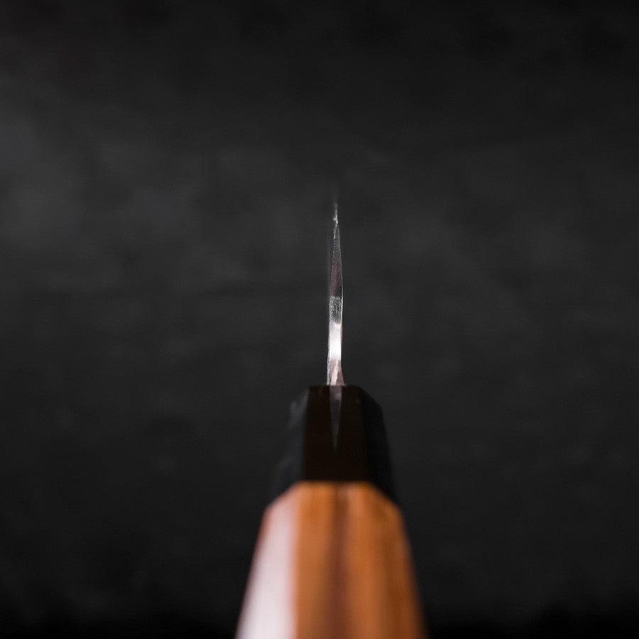 The Gyuto is an all-purpose knife with a pointed tip and a slender blade. The pointed tip enables an easy targeted cut and helps slice meat and fish. It used to be a knife for professional chefs but nowadays is also used by households. Its curved blade helps you apply force to cut food without effort.