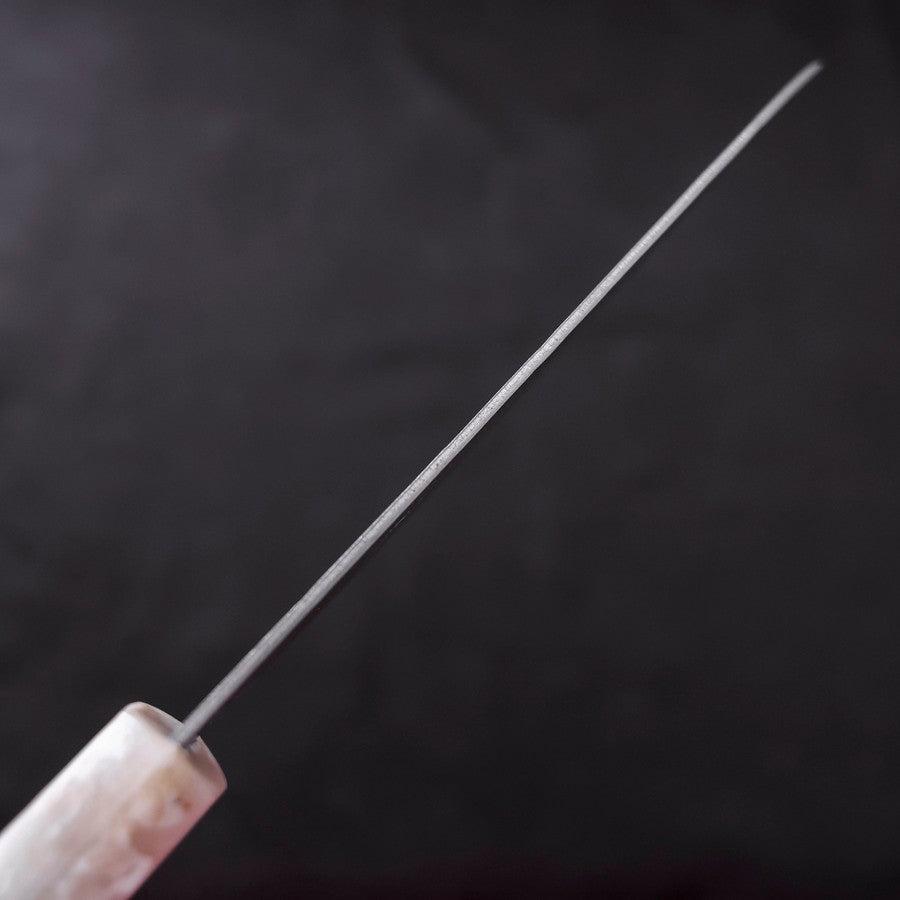 Gingami 3 is categorized to stainless steel for its 13-14.5% Chromium blending ratio. Although it’s a corrosion-resistant stainless steel, actual feel of cutting is closer to the high-end carbon steel, The edge is not slippy but significantly grabbing object fibers.