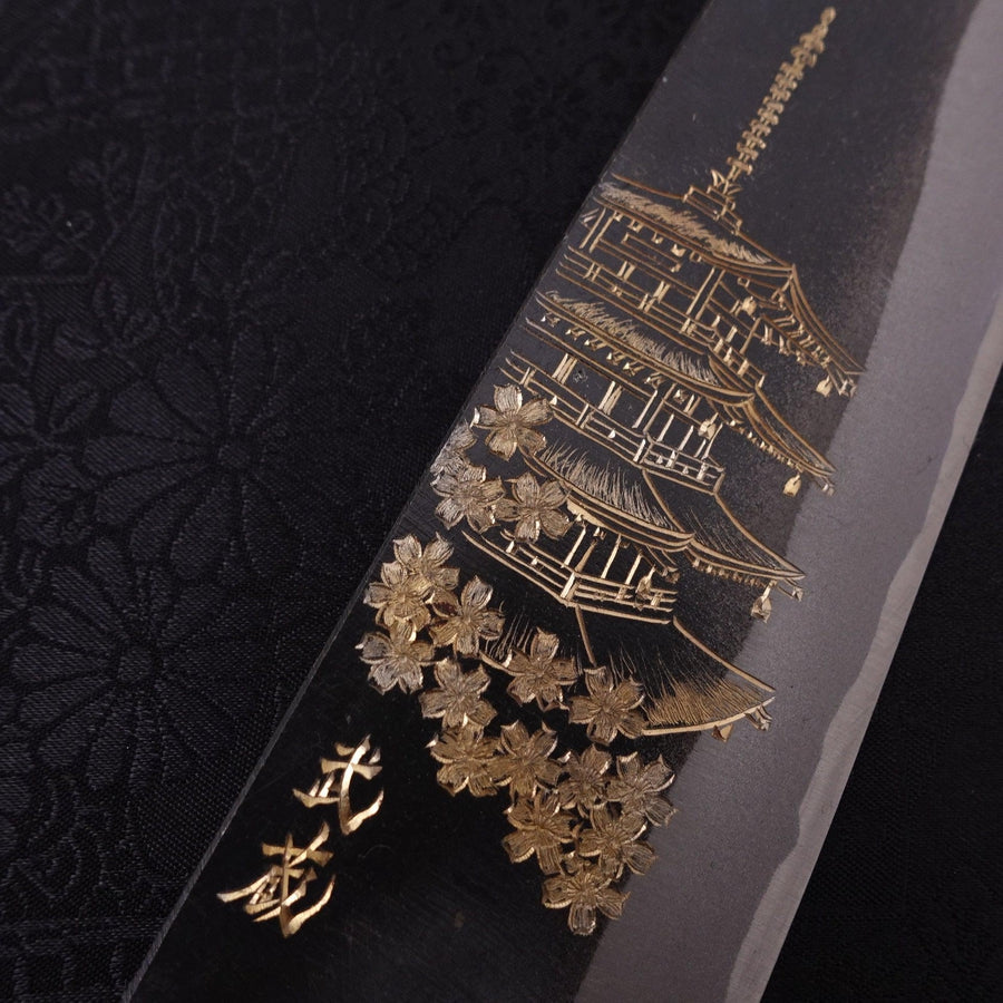 The traditional style of Japanese carving has a long history of simplicity and inspiration. Although this technique (Chokin) is gradually disappearing into history, we hope to do our best to let more people feel its beauty.This is a limited edition of our kitchen knives in collaboration with the carver Asamura Takao, whose over 50 years of carving skills make each piece look so spiritual. Each design has been polished for months, even a year or more.